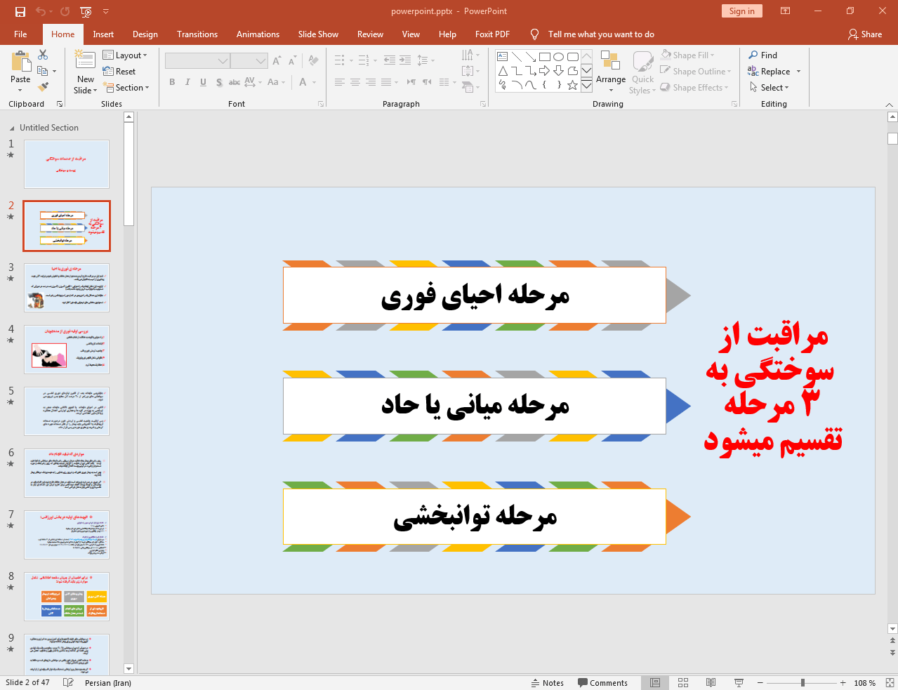 | عنوان | تحلیل پاورپوینت اقدامات پرستاری در زمینه اورژانس سوختگی |