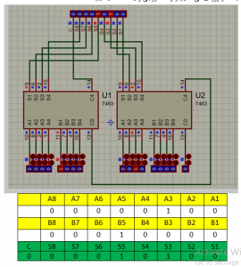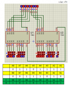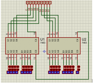 مطابق فرضیات این آزمایش، دو جمع کننده 7483 را کنار هم قرار میدهیم. C0 اولی را برابر صفر قرار داده و C0 دومی را به C4 وصل می کنیم.