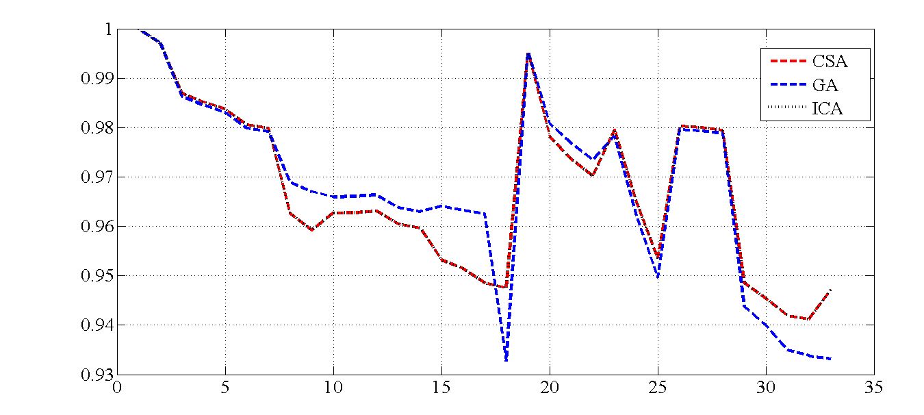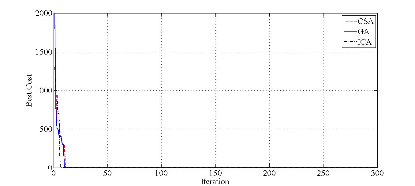 این شبیه سازی با استفاده از نرم افزار متلب (MATLAB) انجام شده است. در شبیه سازی این مقاله از 4 الگوریتم ژنتیک، رقابت استعماری، جستجوی فاخته و الگوریتم جستجوی کلاغ ها استفاده شده است. در ادامه برخی از تصاویر خروجی شبیه سازی قرار داده شده است: