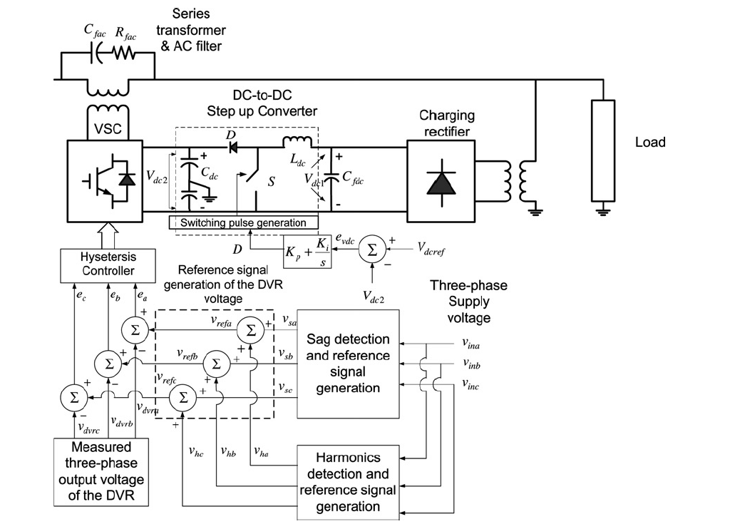 این پروژه، یک DVR پیشنهاد کرده است که می تواند افت ولتاژ موقت عمیق و مدت طولانی را جبران کند و بطور همزمان، هارمونیک های حالت پایدار را جبران نماید. این DVR براساس یک اینورتر سری تغذیه شده با یکسوساز شنت از طریق مبدل فزاینده dc به dc، می باشد. روش بکار گیری قابلیت جبرانسازی هارمونیک برای DVR با استفاده از کنترل ولتاژ هیسترزیس پیشنهاد شده است. طراحی اجزاء DVR در این پروژه ارائه می شوند. تاثیر ضریب توان بار و عمق افت موقت ولتاژ بر اندازه خازن dc یکسوساز شنت و سلف و خازن dc مبدل فزاینده dc به dc تحلیل می شود. نشان داده می شود که بارهای دارای ضریب توان بالاتر نیاز به اندازه خازن dc بیشتر برای هر دو دارد؛ یکسوساز شنت و مبدل فزاینده dc به dc. علاوه بر آن، نشان داده می شود که عمق افت موقت ولتاژ افزایش می یابد، اندازه خازن های dc یکسوساز شنت و مبدل فزاینده dc به dc و همچنین اندازه سلف مبدل فزاینده dc به dc باید افزایش یابد. شبیه سازی های حوزه زمانی DVR، تحت شرایط مختلف شامل ولتاژ تامین دچار اعوجاج و افت ولتاژ موقت دچار اعوجاج، عملکرد DVR پیشنهادی را تایید کردند.