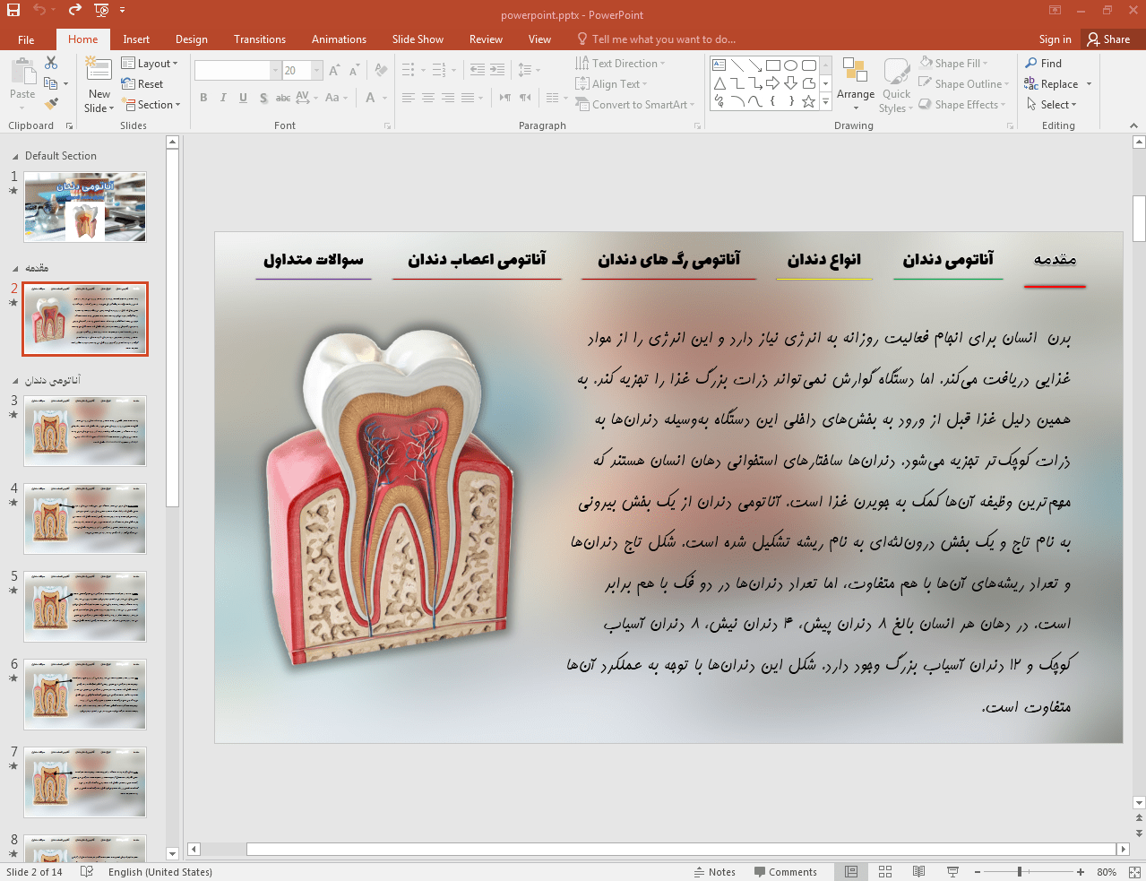 در این پاورپوینت که با قالب (تم) بسیار زیبا و حرفه ای طراحی شده است به بررسی آناتومی دندان به صورت فایل قایل ویرایش در 14 اسلاید پرداخته ایم. در صورت وجود هر گونه مشکل لطفا با بخش پشتیبانی به شماره 09360147484 تماس بگیرید.