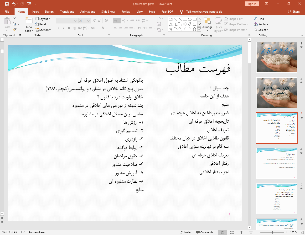 این پاورپوینت در 45 اسلاید تهیه شده و در ادامه نیز تصویر مربوط به اسلاید شماره 3 آن قرار داده شده است: