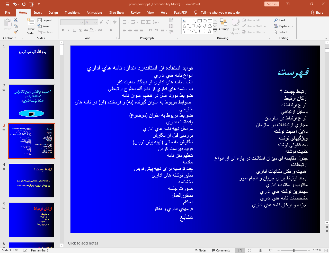این پاورپوینت در 98 اسلاید تهیه شده و در ادامه نیز تصویر مربوط به اسلاید شماره 3 آن قرار داده شده است: