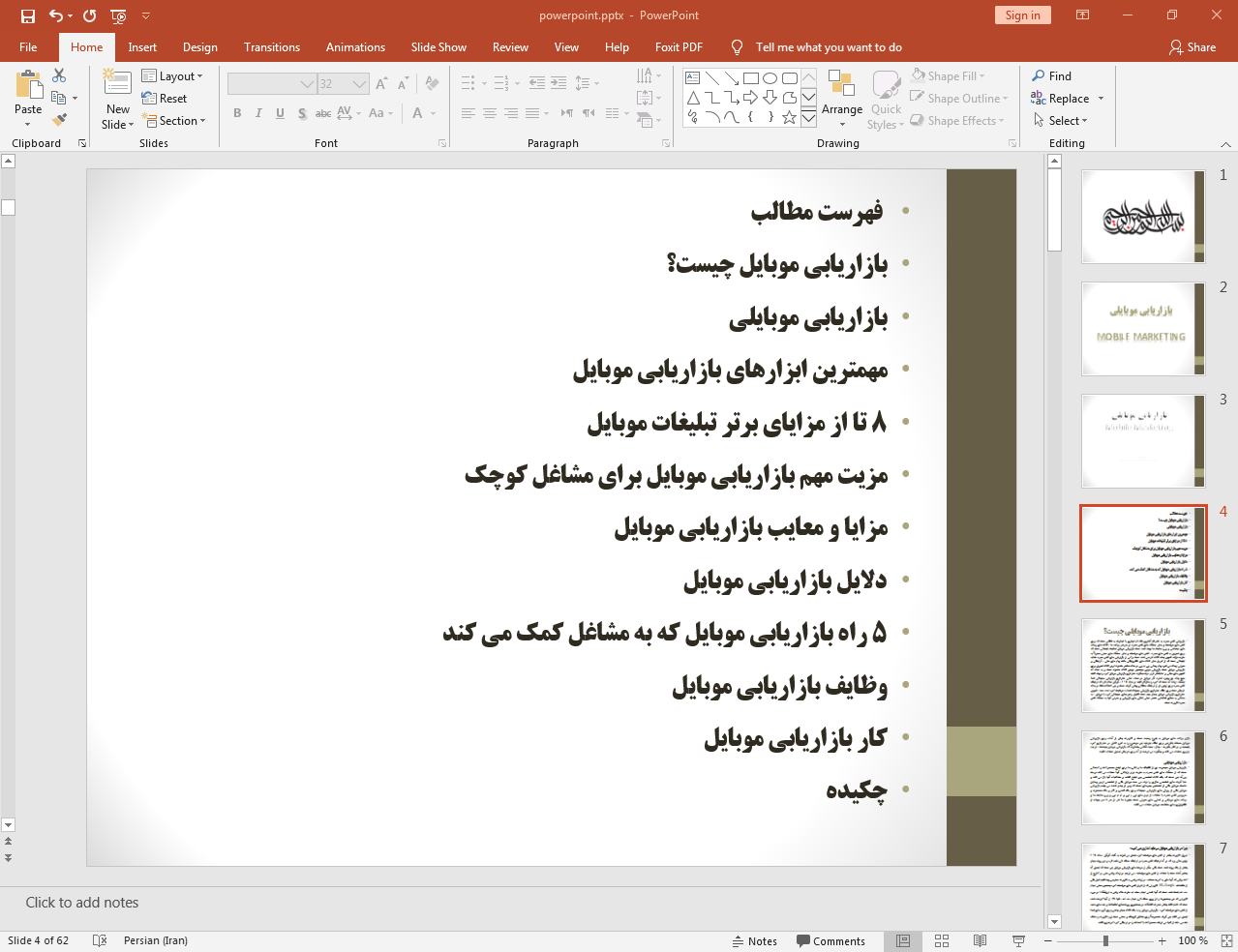 این پاورپوینت در 62 اسلاید تهیه شده و در ادامه نیز تصویر مربوط به اسلاید شماره 4 آن قرار داده شده است: