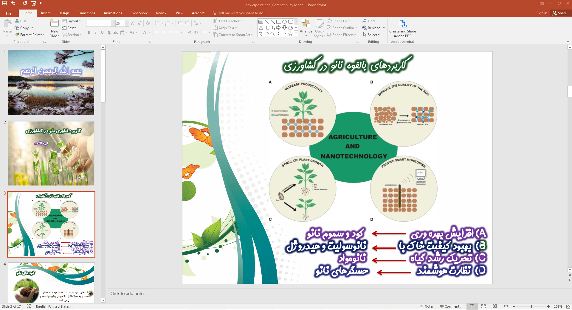 در این پاورپوینت که با قالب (تم) زیبا و حرفه ای طراحی شده است به بررسی کاربردهای فناوری نانو در حوزه کشاورزی در 17 اسلاید به صورت فایل قابل ویرایش پرداخته ایم. در صورت وجود هر گونه مشکل لطفا با بخش پشتیبانی به شماره 09360147484 تماس بگیرید.