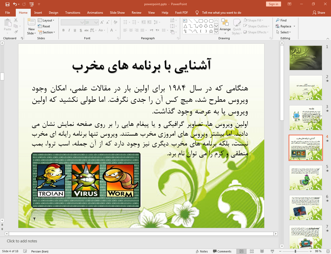 این پاورپوینت در 18 اسلاید تهیه شده و در ادامه نیز تصویر مربوط به اسلاید شماره 4 آن قرار داده شده است: