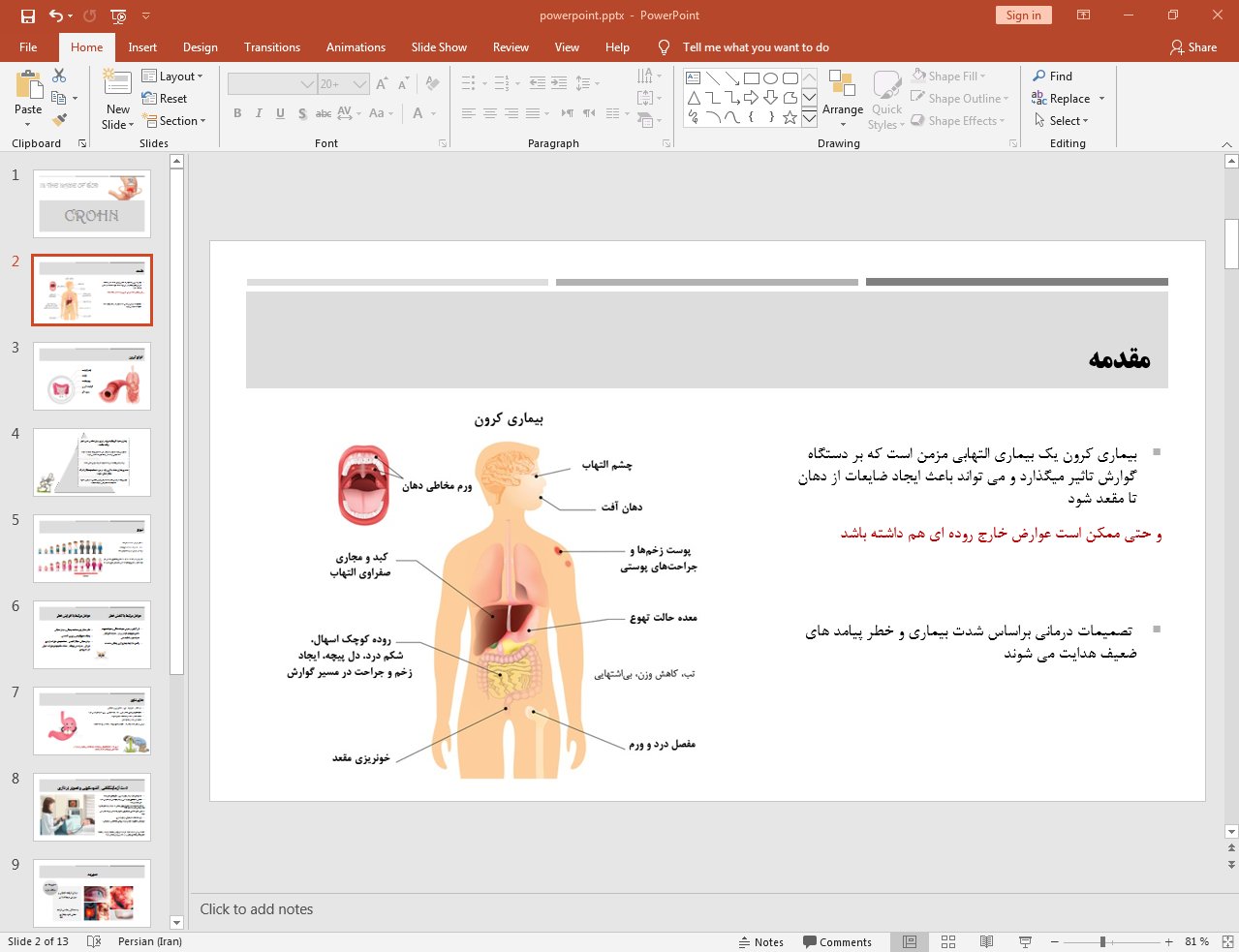 در این پاورپوینت که با قالب (تم) بسیار زیبا و حرفه ای طراحی شده است به بررسی بیماری کرون به صورت قابل ویرایش پرداخته ایم. در صورت وجود هر گونه مشکل لطفا با بخش پشتیبانی به شماره 09360147484 تماس بگیرید.
