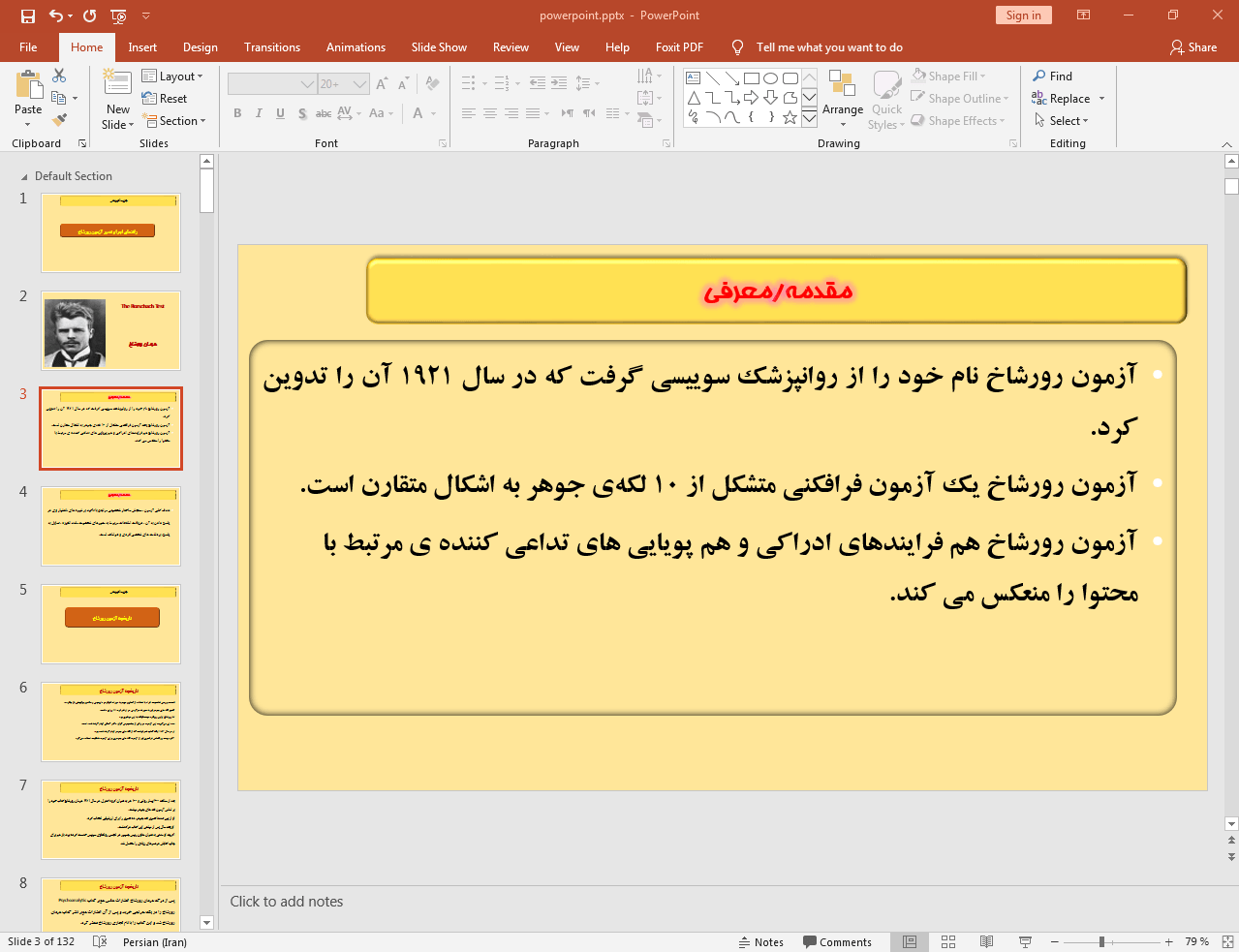 در این پاورپوینت که با قالب (تم) بسیار زیبا و حرفه ای طراحی شده است به بررسی تست شخصیت رورشاخ (تست لکه جوهر) به صورت فایل قابل ویرایش در 132 اسلاید پرداخته ایم. در صورت وجود هر گونه مشکل لطفا با بخش پشتیبانی به شماره 09360147484 تماس بگیرید.
