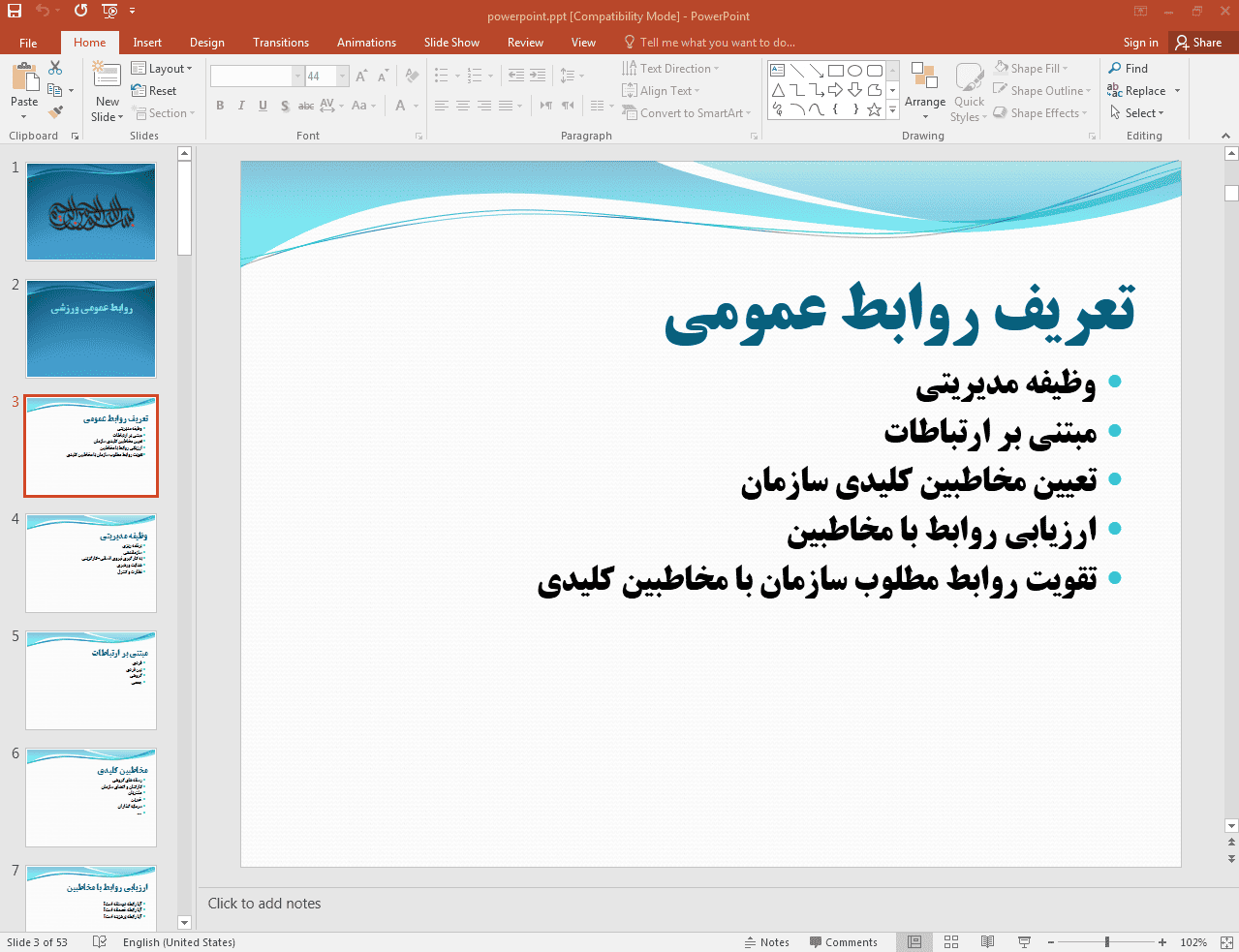 این پاورپوینت در 53 اسلاید تهیه شده و در ادامه نیز تصویر مربوط به اسلاید شماره 3 آن قرار داده شده است: