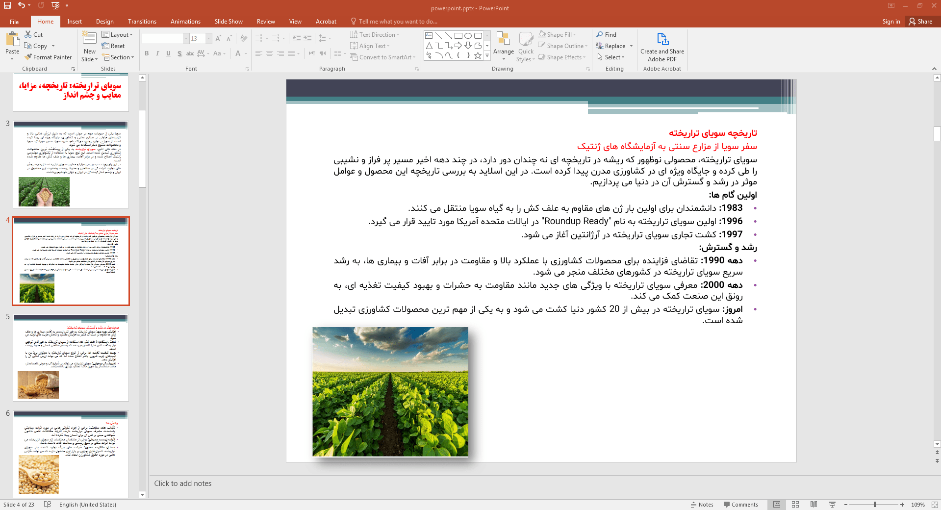 سویا یکی از حبوبات مهم در جهان است که به دلیل ارزش غذایی بالا و کاربردهای فراوان در صنایع غذایی و کشاورزی، جایگاه ویژه ای پیدا کرده است. از سویا در تولید روغن، خوراک دام، شیره سویا، سس سویا، آرد سویا و محصولات متنوع دیگر استفاده می شود. در دهه های اخیر، سویای تراریخته به یکی از پرمناقشه ترین محصولات کشاورزی تبدیل شده است. این نوع سویا با استفاده از تکنولوژی مهندسی ژنتیک اصلاح شده و در برابر آفات، بیماری ها و علف کش ها مقاوم شده است. در این پاورپوینت، به بررسی مزایا و معایب سویای تراریخته، تاریخچه، روش های تولید، اثرات آن بر سلامتی و محیط زیست، وضعیت این محصول در ایران و چشم انداز آینده آن در ایران و جهان خواهیم پرداخت.
