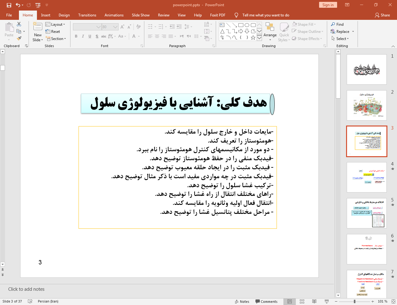 در این پاورپوینت که با قالب (تم) زیبا و حرفه ای طراحی شده است به موضوع فیزیولوژی سلول در 37 اسلاید و فایل قابل ویرایش پرداخته ایم. در صورت وجود هر گونه مشکل لطفا با بخش پشتیبانی به شماره 09360147484 تماس بگیرید.