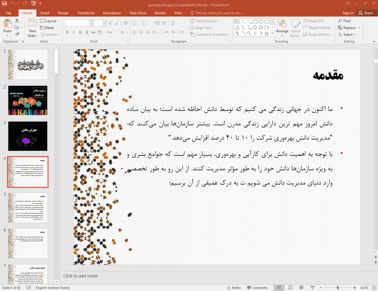 این پاورپوینت در 63 اسلاید تهیه شده و در ادامه نیز تصویر مربوط به اسلاید شماره 4 آن قرار داده شده است: