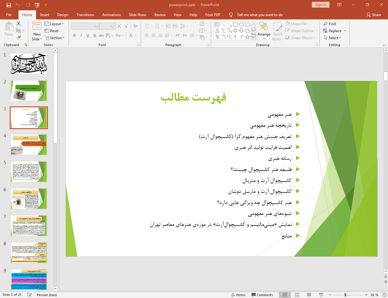 این پاورپوینت در 23 اسلاید تهیه شده و در ادامه نیز تصویر مربوط به اسلاید شماره 3 آن قرار داده شده است: