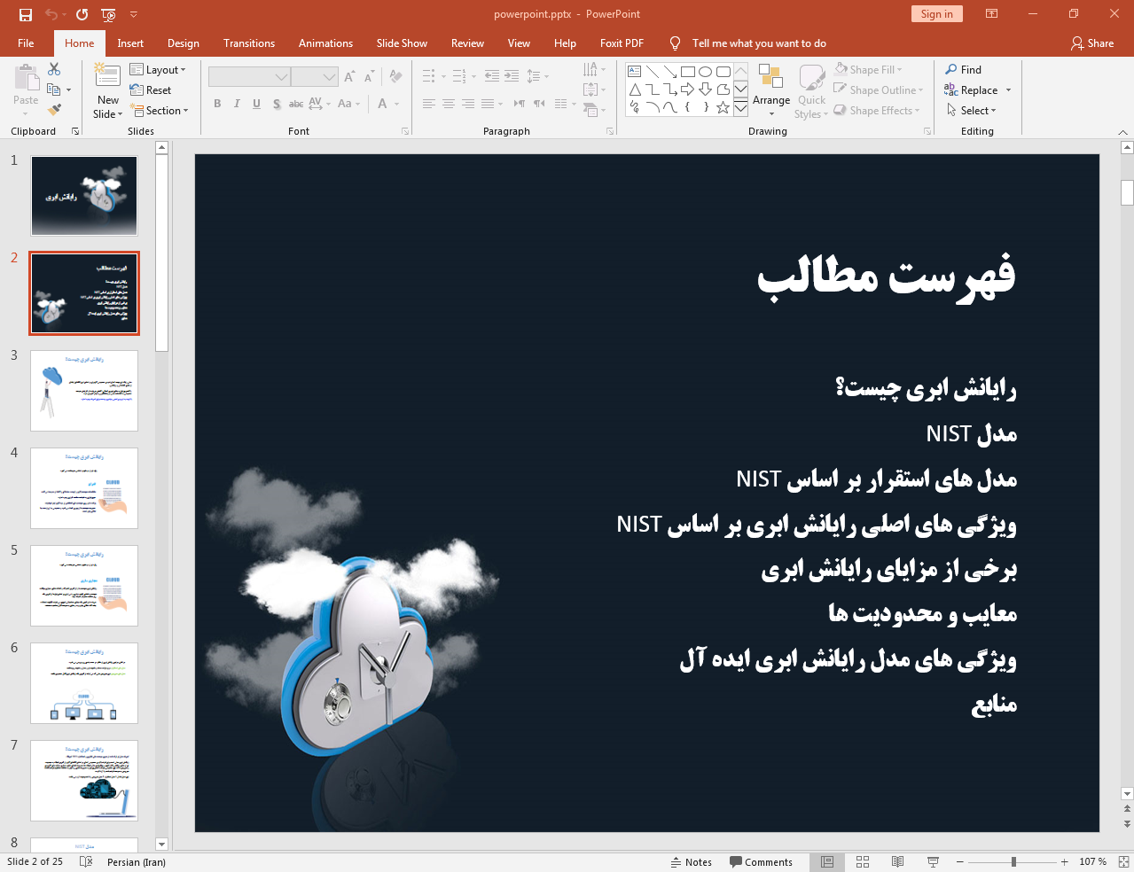 در این پاورپوینت که با قالب (تم) زیبا و حرفه ای طراحی شده است به آشنایی با مفهوم رایانش ابری در 25 اسلاید و فایل قابل ویرایش پرداخته ایم. در صورت وجود هر گونه مشکل لطفا با بخش پشتیبانی به شماره 09360147484 تماس بگیرید.