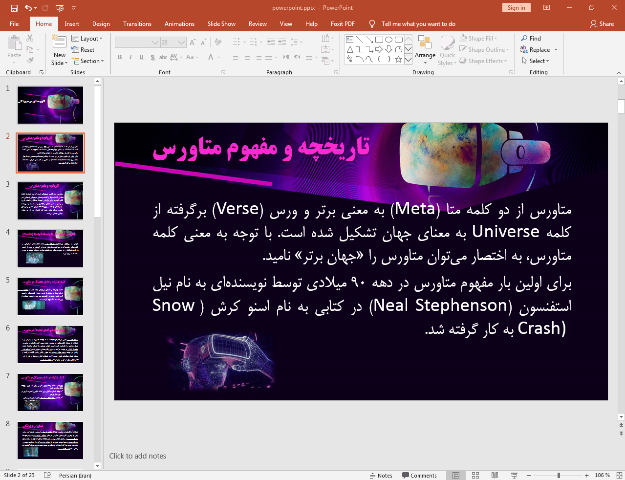 متاورس، یک دنیای دیجیتالی به اصطلاح جایگزین است که با استفاده از ابزارهای سمعی و بصری می تواند قابل دسترسی برای کاربران باشد. در این دنیای مجازی، انوع مختلفی از هوش مصنوعی را می توان شاهد بود، از جمله افرادی به فرم کپی دیجیتالی از افراد واقعی (آواتارها) که قادر به تعامل اجتماعی هستند. کاربردهای مختلفی از متاورس را می توان برای حوزه های مختلف متصور شد. از جمله کاربردهای این فناوری می توان به حوزه هایی همچون بازاریابی، گردشگری و … اشاره نمود. در این پاورپوینت، به دنبال بررسی کاربردهای مختلف متاورس در حوزه پزشکی و سلامت هستیم. این موضوع در این پاورپوینت به صورت گسترده ای مورد بررسی قرار گرفته شده است و اطلاعات شما در این زمینه را تکمیل خواهد کرد. می توانید از این پاورپوینت برای داشتن یک ارائه کلاسی خوب در این موضوع استفاده نمایید.
