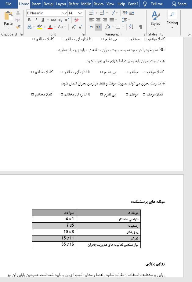 این پرسشنامه در 6 صفحه به صورت فایل ورد (WORD) قابل ویرایش و PDF تهیه شده و دارای 35 پرسش یا گویه و 5 خرده مقیاس (طراحی ساختار، رسمیت، پیچیدگی، تمرکز، نیاز سنجی فعالیت های مدیریت بحران) می باشد. فایل مقاله بیس یا پایه مرتبط با این پرسشنامه نیز در داخل محصول قرار داده شده است. این پرسشنامه دارای روایی و پایایی می باشد و در ادامه نیز تصویر مربوط به یکی از صفحات آن قرار داده شده است: