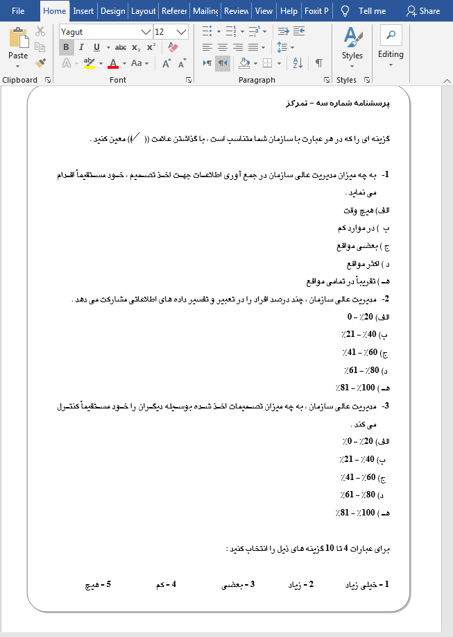 در ادامه، تصویر مربوط به بخشی از فایل پرسشنامه قرار داده شده است: