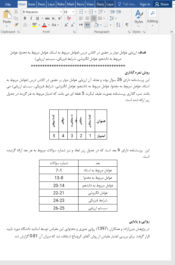 این پرسشنامه در 5 صفحه به صورت فایل ورد (WORD) قابل ویرایش و PDF تهیه شده و دارای 26 پرسش یا گویه می باشد. این پرسشنامه دارای 6 خرده مقیاس می باشد که عبارتند از: عوامل مربوط به استاد، عوامل مربوط به محتوا، عوامل مربوط به دانشجو، عوامل انگیزشی، شرایط فیزیکی و سیستم ارزیابی. فایل مقاله بیس یا پایه مرتبط با این پرسشنامه نیز در داخل محصول قرار داده شده است. این پرسشنامه دارای روایی و پایایی و تفسیر و نمره گذاری می باشد و در ادامه نیز تصویر مربوط به بخشی از فایل قرار داده شده است: