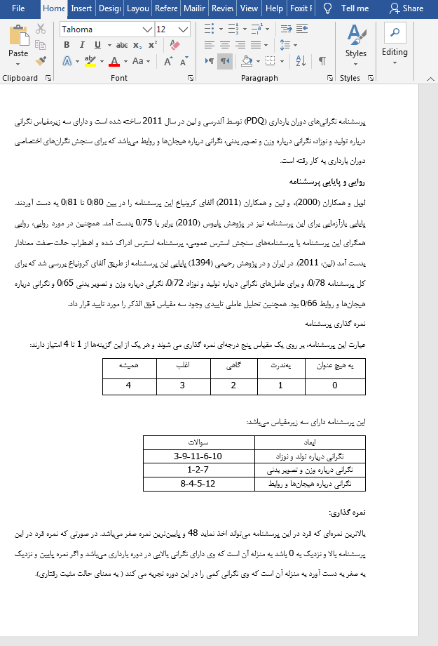 این پرسشنامه در 5 صفحه به صورت فایل ورد (WORD) قابل ویرایش و PDF تهیه شده و دارای 12 گویه یا پرسش می باشد. فایل مقاله بیس یا پایه مورد استفاده در تهیه این پرسشنامه نیز در داخل محصول قرار داده شده است. این پرسشنامه دارای 3 خرده مقیاس می باشد. این پرسشنامه دارای روایی و پایایی بوده و نحوه تفسیر و نمره گذاری آن نیز مشخص شده است. در ادامه نیز تصویر مربوط به بخشی از این پرسشنامه قرار داده شده است: