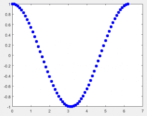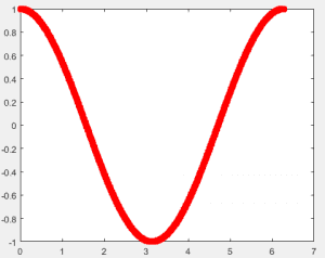 یعنی x با مقدار ۰.۰۱ افزایش یافته و بازای هر مقداری که می گیرد (cos(x محاسبه شده و در نتیجه نمودارش رسم شود. مثل مثال بالا انجام می گیرد و در واقع ابتدا x=[0 0.01 0.02 0.03 . . . ۲*pi] و مثل همین مقدار [(y=[cos(0) cos(0.01) . . . cos(2*pi محاسبه می شود و سپس مثل بالا نمودار رسم خواهد شد.