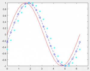 plot(x,y1,’r’,x,y2,’b–o‘,x,y3,’c*‘)