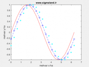 مثال: نمودار سه تا sin در یک نمودار با مشخص بودن عنوان با نام www.fardapaper.ir و محور افقی با نام mehvar x ha و محور عمودی با نام mehvar y ha
