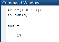 تابع sum در واقع جمع کننده می باشد و هر موقع بخواهید از جمع چند ماتریس استفاده کنید کافیست از این تابع بهره بگیرید. به عنوان مثال فرض کنید یک ماتریسی به صورت a=[1 5 4 7] دارید و می خواهید همه ی درایه های آن را با هم جمع نماید کافیست از دستور زیر برای این کار استفاده نمایید (sum(a که شکل زیر نتیجه ی این عمل را نشان می دهد.
