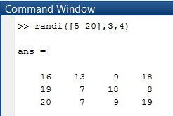 به عنوان مثال می خواهید یک ماتریس ۳ در ۴ حاوی اعداد صحیح بین ۵ و ۲۰ داشته باشید کافیت از دستور زیر استفاده نمایید (randi([5 20],3,4 که نتیجه را در زیر می بینید.
