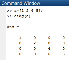 حال اگر بخواهید از همین داده های به دست آمده یک ماتریس قطری بسازید کافیست دستور زیر را اعمال نمایید ((diag(diag(a که نتیجه به صورت زیر حاصل می شود.