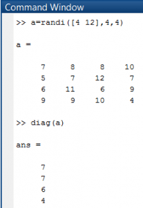 در واقع کار تابع diag، با قطر اصلی ماتریسها می باشد. اگر یک ماتریس دیگری هم داشته باشید و بخواهید قطر اصلی آن را استخراج نمایید از این تابع می توانید استفاده نمایید. به عنوان مثال یک ماتریس فرص کنید یک ماتریس(a=randi([4 12],4,4 دارید و میخواهید درایه های قطر اصلی آن را استخراج کنید در این صورت کافی است از (diag(a استفاده نمایید که در شکل زیر نمایش داده شده است.