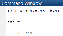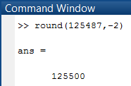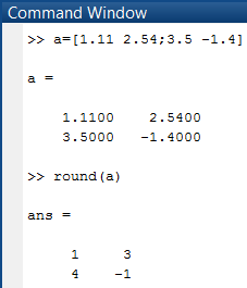 یکی دیگر از توابع پر کاربرد در متلب تابع round می باشد که کار round کردن به صورت ریاضی را انجام خواهد داد. به عنوان مثال اگر عدد ۳.۱ به این تابع داده شود تابع آن را ۳ می خواند و اگر مقدار ۳.۶ به آن اعمال شود تبدیل به ۴ خواهد شد برای ۳.۵ نیز عدد ۴ را به عنوان خروجی خواهد داد. به عنوان مثال می خواهید round ماتریس a=[1.11 2.54; 3.5 -1.4] را استخراج کنید که نتیجه در زیر نمایش داده شده است.