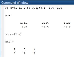 فراخوانی تابع در متلب هر عدد ورودی را به نزدیک ترین عدد صحیح و بزرگ تر از خودش تبدیل می کند. به عنوان مثال اگر ۲.۴ به آن وارد شود خروجی ۳ خواهد شد و اگر ۱.۹- به آن وارد شود عدد ۱- خروجی آن خواهد شد. شکل زیر نیز نمونه ای از عملکرد این تابع را نشان می دهد.