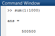 مثال: می خواهیم حاصلجمع اعداد از ۱ تا ۱۰۰۰ را محاسبه کنیم. کافیست دستور زیر را در متلب وارد نماییم که به راحتی اینکار صورت می گیرد. (Sum(1:1000 که در ریاضی از فرمول n*(n-1)/2 برای این کار استفاده می شود.