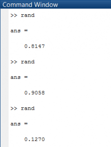 یکی از مهم ترین تابع ها در متلب تابع rand می باشد. این تابع اعداد تصادفی بین صفر و یک را برای ما تولید خواهد نمود. نمونه مثالی از این تابع را مشاهده می کنید. طبق این شکل می بینید در هر بار اجرا یک مقدار متفاوت و بین صفر و یک توسط متلب ارائه شده است.