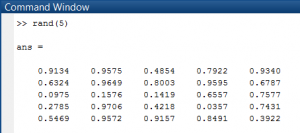 اگر بخواهیم اعداد تصادفی حاصلی به صورت ماتریس مربعی با مرتبه دلخواه ظاهر شود کافیست داخل تابع rand مرتبه ماتریس را بنویسم. به عنوان مثال می خواهیم اعداد بین صفر و یک را در یک ماتریس ۵*۵ داشته باشیم. شکل زیر این مورد را نشان می دهد.