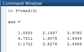 حال اگر هدفتان تولید عددی بین صفر و یک عدد دلخواه باشد کافیست تابع rand را در آن ضرب کنید. به عنوان مثال یک ماتریس مربعی با مرتبه ی ۳ نیاز دارید که اعداد داخل آن بین صفر و ۵ باشد در این صورت کافیست دستور زیر را وارد نمایید. (۵*rand(3 که نتیجه در شکل زیر ارائه شده است.