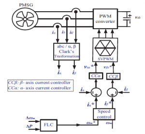 این پروژه، یک طرح کنترل سرعت متغیر برای سیستم تبدیل انرژی باد متصل به شبکه (WECS) با استفاده از مولد سنکرون مغناطیس دائم (PMSG)، پیشنهاد می دهد. این الگوریتم کنترلی، حداکثر توان سرعت باد پایین تر از سرعت اسمی توربین های باد را ردیابی می کند و تضمین می کند که توان از توان اسمی برای سرعت باد نسبت به مقدار اسمی، عبور نمی کند. این الگوریتم کنترلی از «کنترلر منطق فازی» (FLC) برای رسیدن موثر به این هدف استفاده می کند. توربین بادی از طریق PWM-VSC پشت به پشت به شبکه متصل می شود. دو بسته نرم افزاری شبیه سازی کامپیوتری موثر (PSIM و Simulink) برای انجام کارآمد شبیه سازی استفاده می شود. این سیستم کنترل دو کنترلر برای مبدل های طرف مولد و طرف شبکه دارد. عملکرد اصلی کنترلر طرف مولد، ردیابی حداکثر توان از طریق کنترل سرعت دورانی توربین باد با استفاده از FLC، می باشد. در مبدل طرف شبکه، کنترل توان اکتیو و راکتیو با کنترل مولفه های جریان محور q وd، به ترتیب حاصل می شود. جریان محور d ، برای ضریب توان 1 برابر با صفر در نظر گرفته می شود و جریان محور q برای تحویل توان جاری از لینک dc به شبکه برق، کنترل می شود.